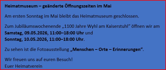 Das Heimatmuseum ist am Jubiläumswochenende der Gemeinde, 1100 Jahr Wyhl am Kaiserstuhl, an beiden Festtagen von 11:00 Uhr bis 18:00 Uhr geöffnet!
