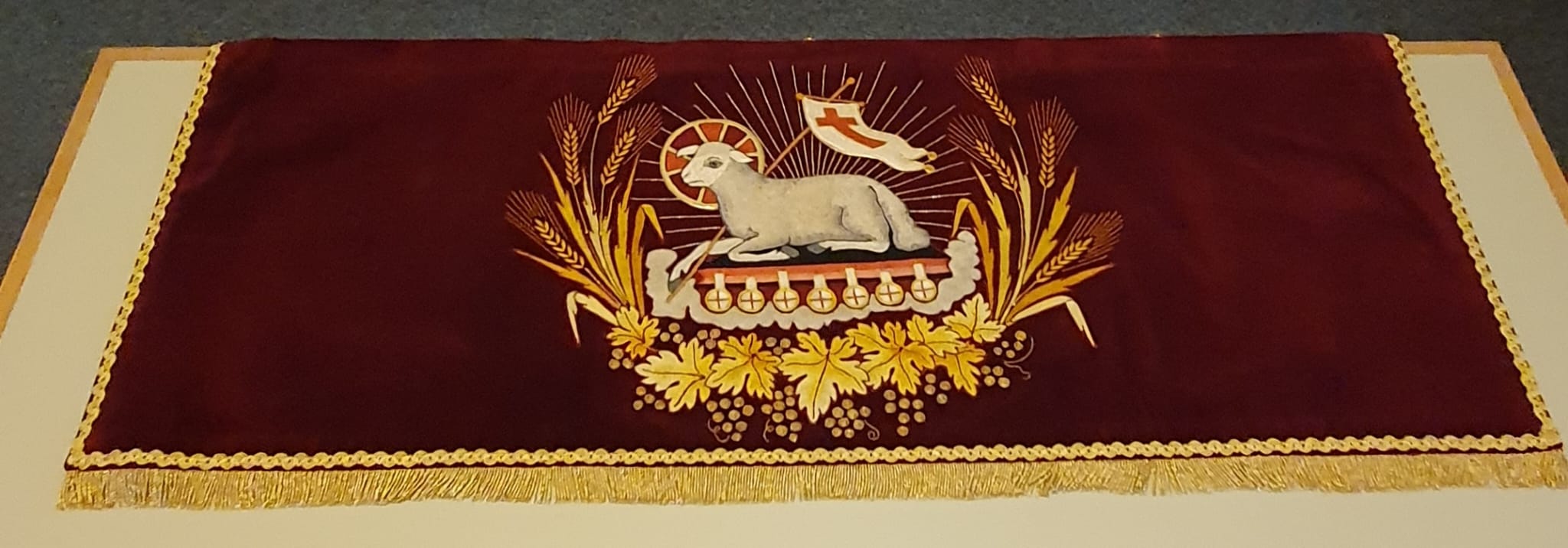 Stoffbild vom Wyhler Ostergrab neu renoviert, wieder in der Wyhler Kirche. Durch die Unterstützung von unserem Heimatverein, ermöglicht durch die Raiba Gewinnsparhilfe, konnten Pfarrer Schätzle und Vorstand Kniebühler das Stoffbild präsentieren. Im bayrischen Kloster von Ordensschwestern wieder erneuert. Dieser Wyhler Brauch, ein Ostergrab aufzubauen, ist sehr alt und 1733 schon beschrieben.